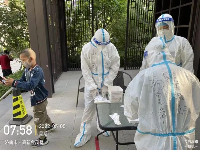 由于一直在高溫下“全副武裝”,志愿者的防護(hù)服早已被汗水浸濕,手掌被泡得發(fā)白,臉上也被口罩勒出了痕跡,更有志愿者出現(xiàn)了頭暈、流鼻血等中暑癥狀。盡管如此,他們也是稍加休整,便再次沖鋒向前。休息時間,志愿者們席地而坐,匆匆吃完奔赴崗位,因忙碌而錯過飯點(diǎn)更是常事,然而他們卻從未有過怨言;腰肌勞損、椎間盤不好的團(tuán)隊(duì)干部即使腰疼的直不起來,也依舊抵擋不住他助力抗疫的熱情與行動?!▲喼驹刚邔敶ㄔ趨f(xié)助核酸檢測時,有一個小男孩很不配合,由于當(dāng)天的核酸檢測并沒有貼紙,男孩媽媽便偷偷準(zhǔn)備了小貼畫,拜托尋魯川給小朋友貼上。尋魯川很感動,并且樂意幫忙,尋魯川說:“他兩只大眼睛直勾勾的盯著貼紙看,特別萌,心都被萌化了,真是開心了一整天,所有的疲憊都一掃而空?!?nbsp;…… 在抗“疫”前線,小鴨人和社區(qū)居民們互相理解,互相配合,如此令人感動又暖心的事跡不勝枚舉。