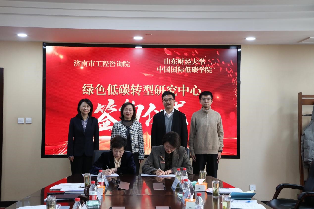 會上,雙方圍繞 “綠色低碳轉(zhuǎn)型研究中心”未來的目標定位、業(yè)務(wù)方向和運行模式等內(nèi)容進行交流探討。隨后,濟南市工程咨詢院副院長兼總會計師黃健與山東財經(jīng)大學(xué)中國國際低碳學(xué)院執(zhí)行院長王璟珉共同簽署“綠色低碳轉(zhuǎn)型研究中心”合作協(xié)議。